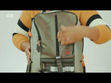 - The front of the bag has a vertical zip pocket with a webbing puller that has Rebel Squadron helmet icons & Aurebesh text (translates to X-Wing)